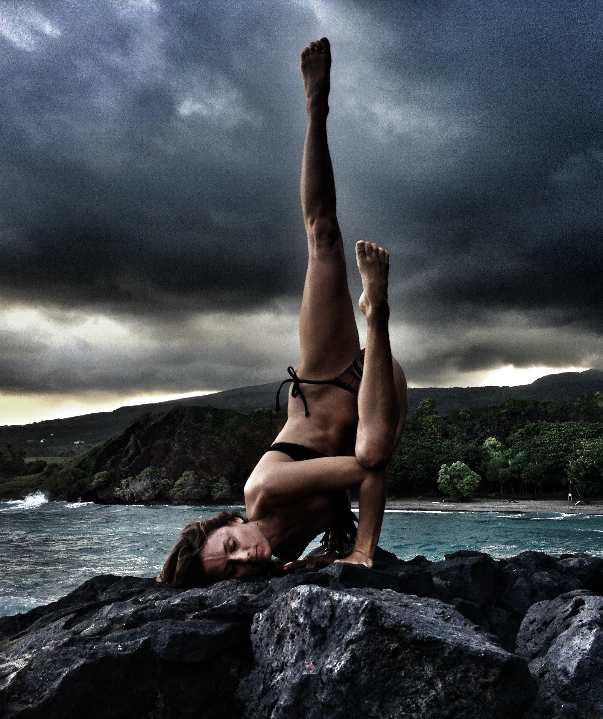 7. From side crow pose turn gaze toward the bent knees and slowly lower the right temple onto the mat . The right shoulder will decend for the mat but will not touch.